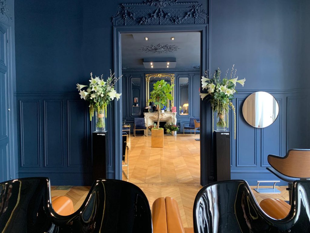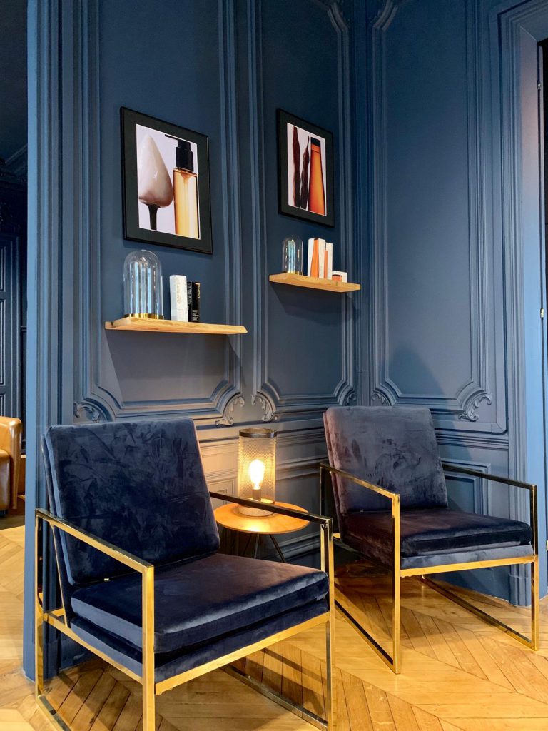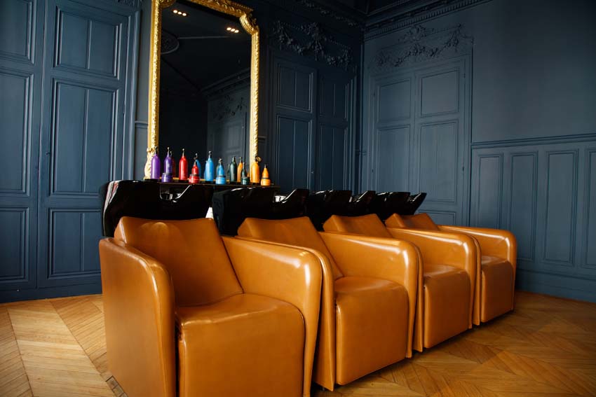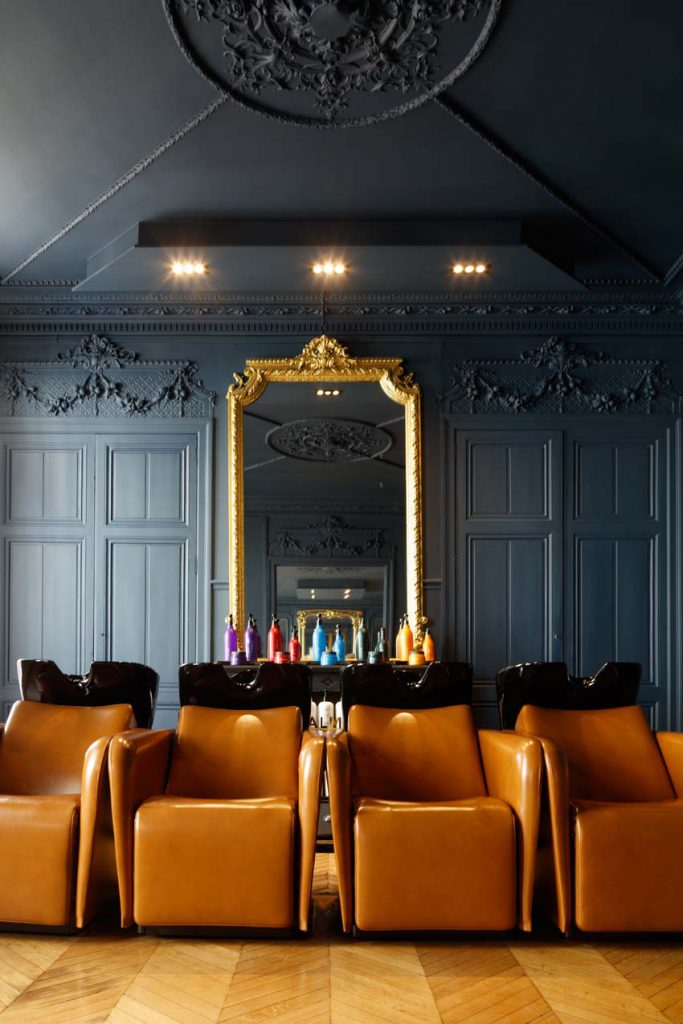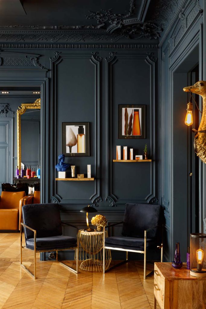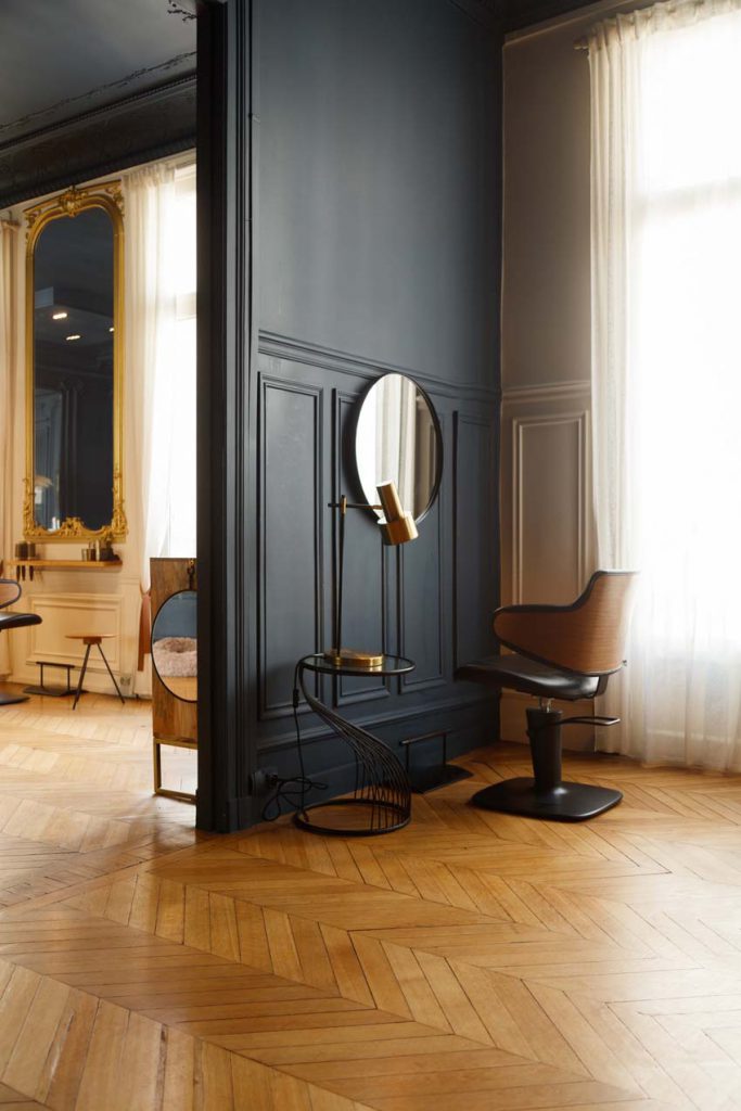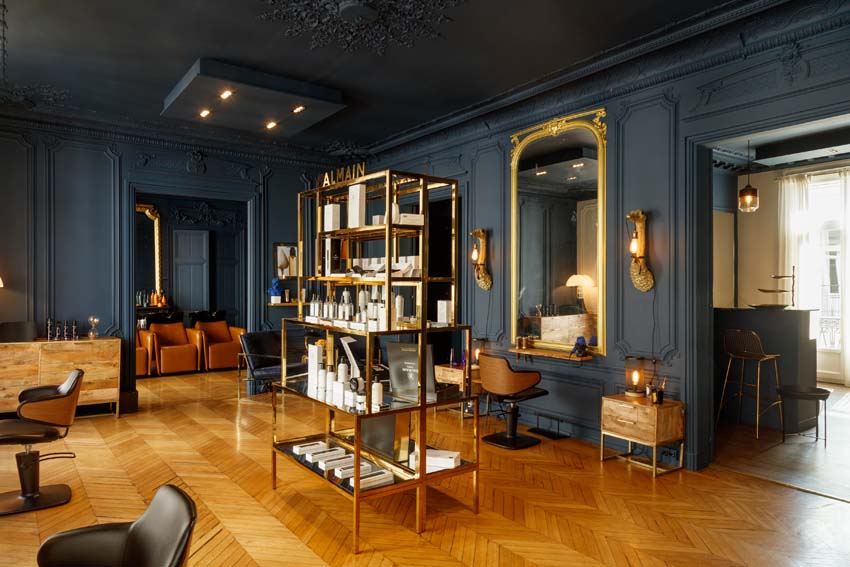 On se laisse envouter par la profondeur de ce bleu, qui donne un cachet tout particulier. La couleur conçue sur mesure évolue en fonction de la luminosité de la journée. Un côté boudoir assumé, à l’esprit cocooning, grâce aux touches d’or et aux teintes boisées, assure une atmosphère chaleureuse et intime. Les bacs à shampooing Maletti ajoutent une nouvelle touche d’élégance, rehaussés par les somptueux miroirs et le parquet en point de Hongrie. Le mobilier donne au tout un aspect contemporain et soigné. La cliente peut ainsi déambuler dans cet espace décloisonné confiante du résultat à la hauteur de ses espérances.