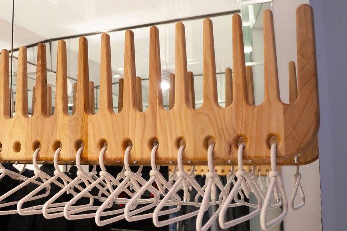 Les meubles, conçus par Aldo Coppola Jr et réalisés par Riva 1920, proviennent du recyclage des « Briccoles », issues de la lagune vénitienne. Les postes de travail appelées « Beccuccio » sont réalisées en bois de cèdre pour leur agréable parfum. Les fauteuils « Komoda » allient design et confort, tandis que les petits canapés d’attente sont en forme de brosse « Audrey ». Le porte-manteaux « La Pettinous » ressemble à un grand peigne porte-vêtements.