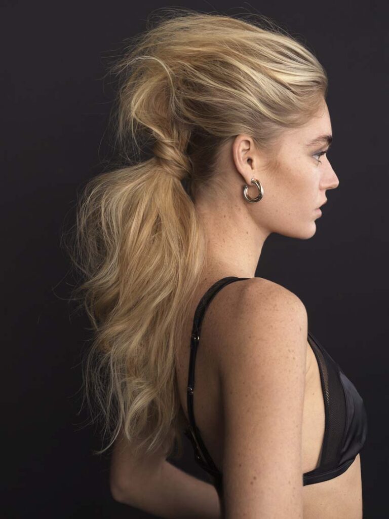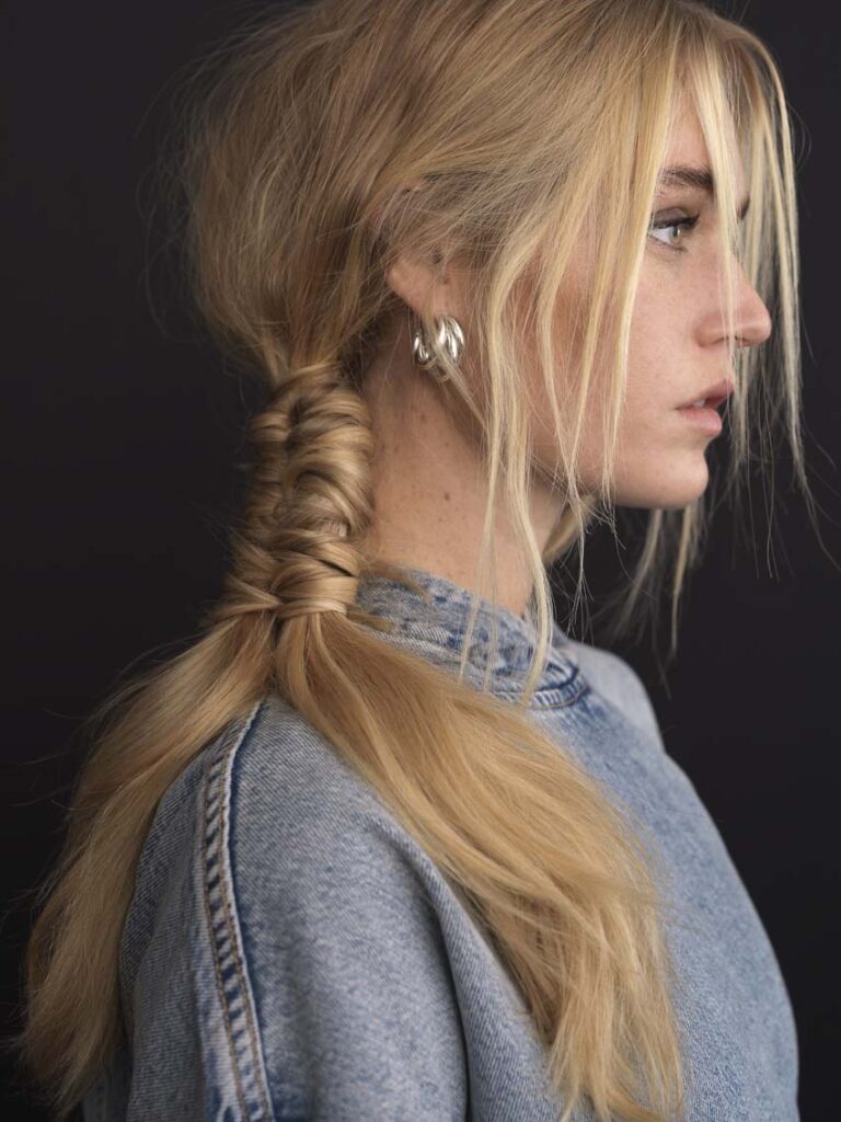 Cette technique de coloration exige une application et une méthode parfaite. Protégée au préalable par notre soin technique Tataki, le balayage est tricoté le plus finement possible, mèche après mèche, avec la poudre BLOND ME par Schwarzkopf professionnel. Pour un contour naturel et plus marqué, à l’aide d’une brosse, le visage d’Andréa est illuminé.