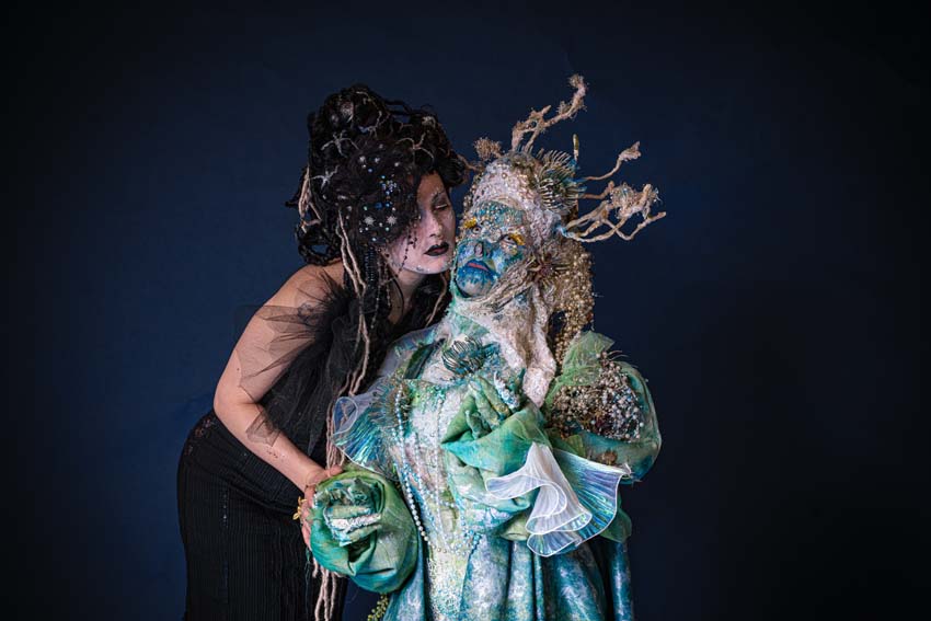 Vous l’aurez compris Marie Ausina n’est pas une coiffeuse comme les autres. Elle nous explique : « Je suis à la base plasticienne, costumière et performeuse. J’ai fait des études d’arts appliqués dans la mode à Paris. Le métier de la coiffure est venu plus tard avec l’envie d’apporter un soin à la personne. Mon imaginaire m’a toujours poussée à créer et incarner des créatures fantasmagoriques que je fabrique avec des éléments que je chine, des tissus anciens, des matériaux détournés. » Ses créatures racontent des histoires visuelles et émotionnelles par leur présence, leurs mouvements et les scénographies.