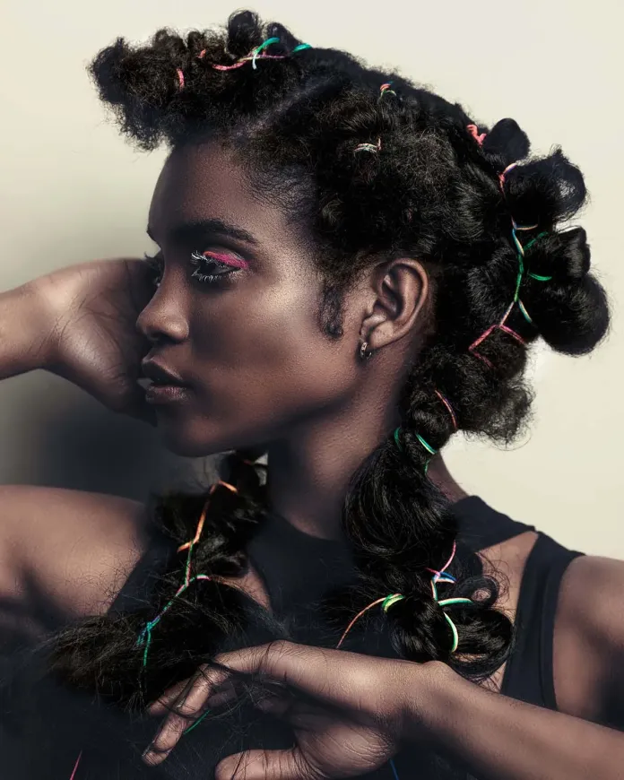 Mood Indigo est aussi le titre d’une composition de jazz des années 1930 de Duke Ellington, reprise plus tard par la chanteuse préférée de notre artiste, Nina Simone. On peut le retrouver dans son album de 1958, Little Girl Blue. « Miss Simone était, bien sûr, une militante infatigable des droits civiques et elle est mon inspiration pour cette collection. J’y célèbre la beauté et la force des femmes noires et de leurs cheveux, leur pouvoir et leur allure. »
